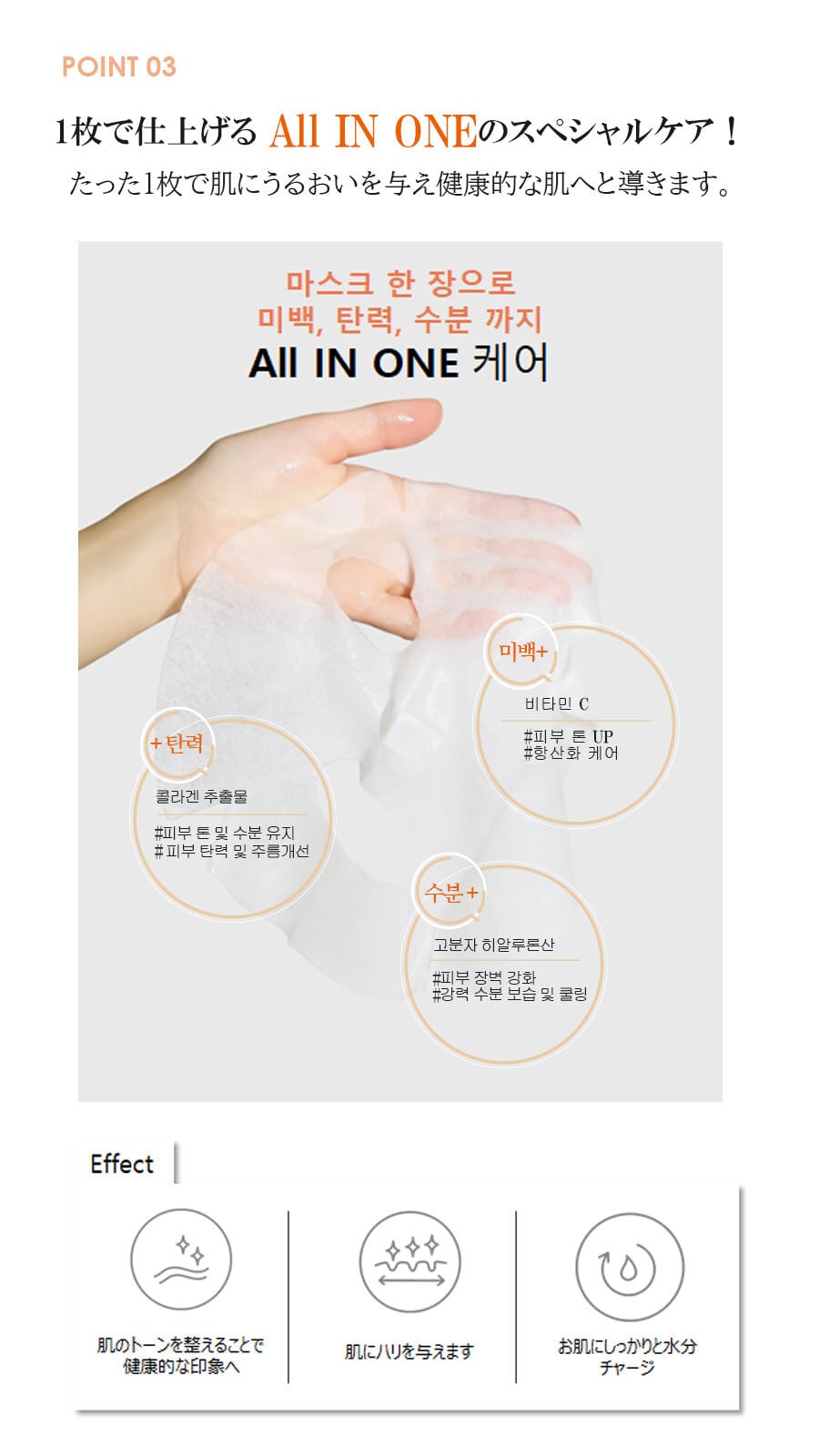 [使用上の注意]1.お肌に合わないときは、ご使用をおやめください。2.化粧品の使用中にお肌に赤み、はれ、かゆみ、刺激等の異常が現れた場合には、使用を中止してください。そのまま化粧品類の使用を続けると症状を悪化させることがありますので、皮膚科専門医等にご相談されることをおすすめします。3.傷やはれもの、しっしん等の異常がある部位には使用しないでください。4.目に入らないようにご注意ください。万が一目に入ったときは水またはぬるま湯で十分に洗い流してください。すすいでも目に異物感が残る場合には、眼科医にご相談ください。5.一度使用したマスクの再使用はしないでください。