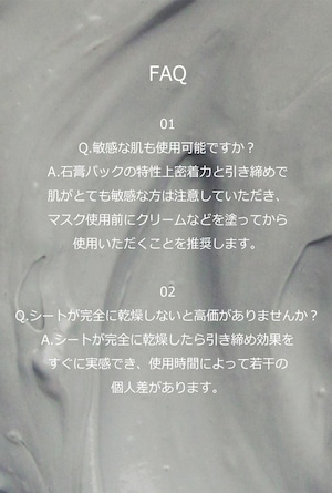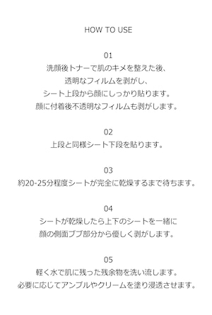 ■使用方法:1洗顔後、化粧水などで肌のキメを整えます。2本製品を開封し透明なフィルムを剥がしたあと、目と鼻を合わせ顔に付着し、反対側の不透明フィルムを剥がします。3同様に口に合わせ下部分のシートを付着し、約20-25分程度シートが完全に乾くまで待ちます。4シートが乾燥したら上下のシートを一緒に顔の側面から優しく剥がします。5顔に残った残余物はぬるま湯で洗い流し、スキンケアの続きをして完了です。
